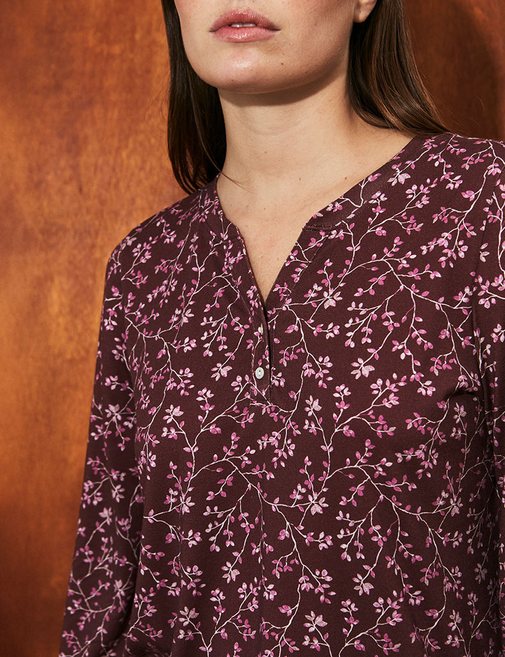 The Marie Top in Merlot Bloom offers a sophisticated look, featuring ultra-soft Pima Modal fabric. Its V-neck button-up design and tailored sleeves create an elegant silhouette. Pair perfectly with the Rainfall Drops Pants for a coordinated set. Enjoy our Luxury Finish - a special washing process that enhances fabric softness, creating a subtle drape and unique sensation against your skin.