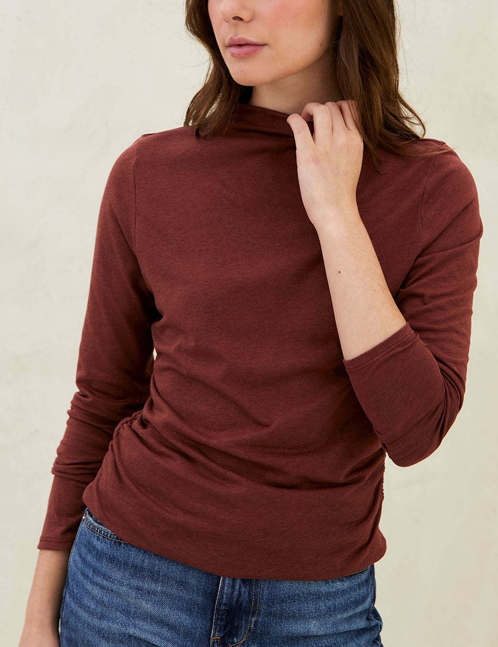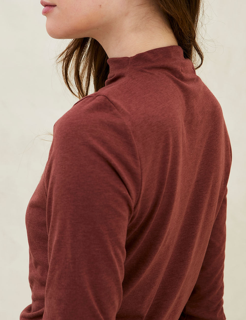 The Nara Top Nutmeg is a seasonal essential that elegantly enhances your silhouette. Featuring a high neckline and long sleeves, it offers a modern and sophisticated look perfect for those wanting a statement basic. Made from a blend of Pima Cotton and Lyocell—a soft, breathable, and durable plant-based fiber—this top is gentle on sensitive skin. A refined staple that effortlessly blends style, comfort, and sustainability.