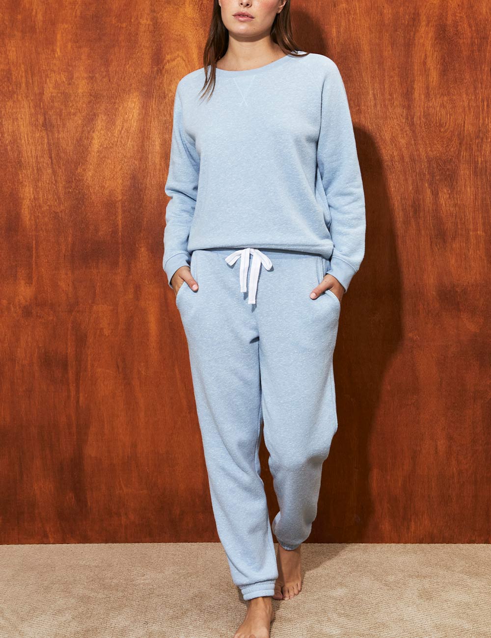 Experience the luxury of Olimpia Jogger Morning Sky, crafted with cotton for a perfect fit at the waist and ankles, ensuring both comfort and structure. Made from Cloudy Fleece, a marbled exterior and ultra soft interior, providing lightweight warmth, softness, and durability. Pair it with the Anya Sweatshirt for a complete look, or mix and match with a basic. Embrace the essentials of winter, designed to keep you cozy and undisturbed by the cold.