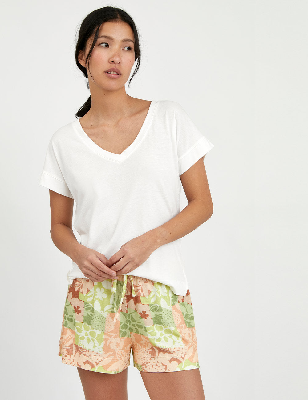 Freshness and style in one piece! The Short Sunset Reef, featuring a high-waisted cut and a delicate decorative bone-colored bow, are the perfect addition to your summer nights. Experience the softness of Pima Cotton from the very first touch on your skin. Pair it with a Denia or Harper Top for this season. Luxury Finish – A special treatment we give our fabrics for an enhanced feel against the skin and a subtle drape that offers a unique sensation.